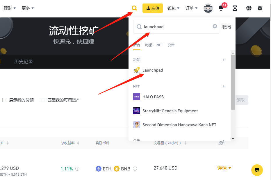 1.打开币安官网登录,点击右上角的搜索图标,然后在搜索中输入launchpad就会显示出来,然后点击launchpad。
