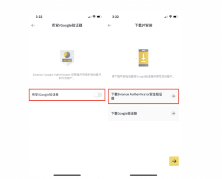 2.点击“币安/Google验证器”旁边的滑动按钮,选择下载Binance Authenticator安全验证器,或者下载Google验证器。如果您已经安装了币安验证器App,则可以直接点击➡继续。
