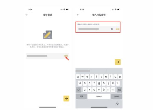 3.系统将生成一个重置代码(16位密钥)。请将这个16位密钥记录在纸上,并妥善保存在安全的地方。然后,点击“复制”按钮,将刚刚备份的16位密钥粘贴到相应的位置,并点击➡以进入币安验证码设置流程。