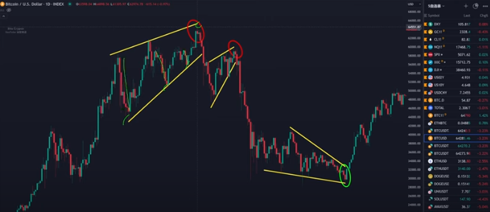 我们要怀疑楔形的空间。如果价格涨得很高,高点出现楔形,可能是主力在吸引散户追价。后面是否会下跌?可能是吸引散户卖出,因为历史上,比如看一下 2021 年,当时价格达到了 65K。2021 年 2 月的高点、3 月的高点和 65K 的高点,跟几个低点相比,下跌不够充分。有可能是涨得太多了,主力吸引散户追价,然后价格下跌了。这也包括这次上涨又吸引了散户买入,又形成了一个看跌的楔形。后面价格下跌了。所以看一下现在的下跌,要留意昨天提到的支撑,这两根蜡烛看起来像是多头吞噬,64K 不能跌破。如果跌破了,我们要怀疑主力的目的是否是吸引散户。